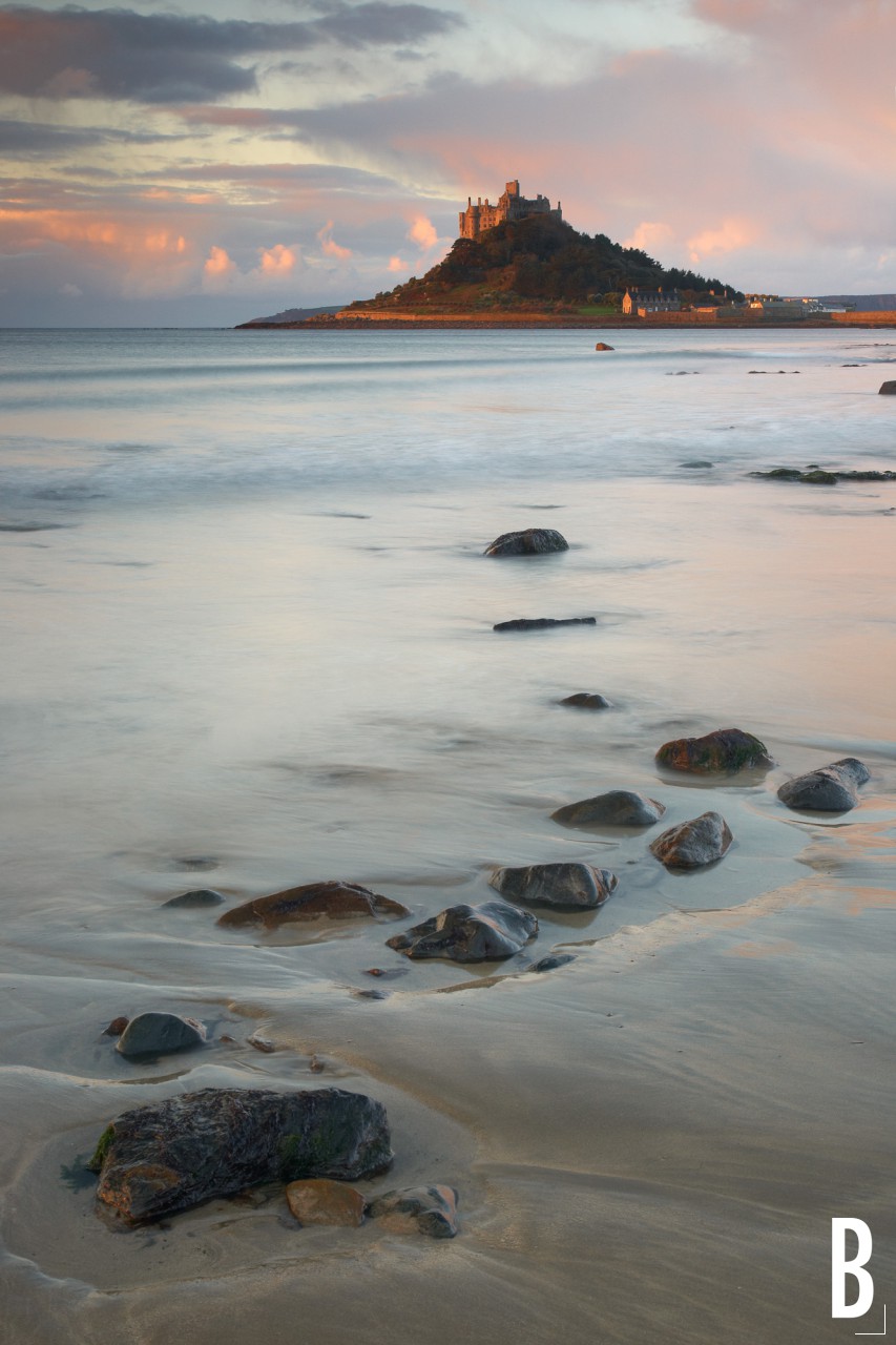 St Michael's Mount op een eiland in de zee bij Cornwall met stenen op het ondergelopen strand op de voorgrond.