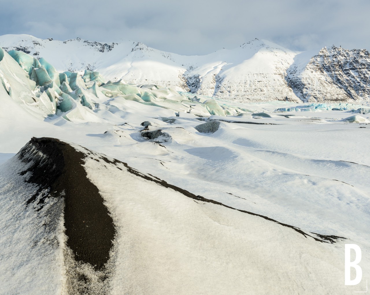 Besneeuwd gletsjerpuin en ijs van Skaftafellsjokull gletsjer.