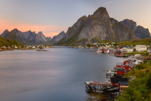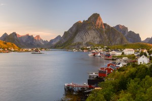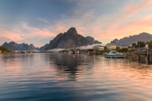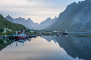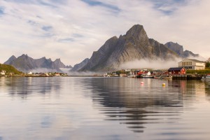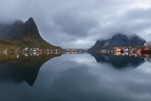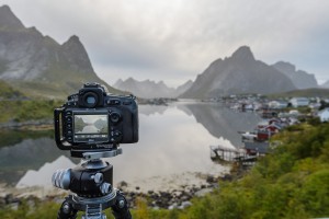 Nikon digitale camera fotografeert reflecties van de bergen in een windstille fjord nabij het bekende vissersdorp van Reine.