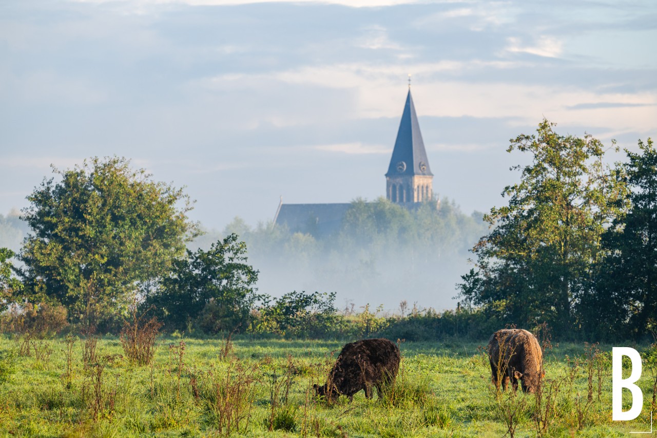 De kerk van Pasbrug steekt boven de mist uit, gezien vanaf het Mechels broek.