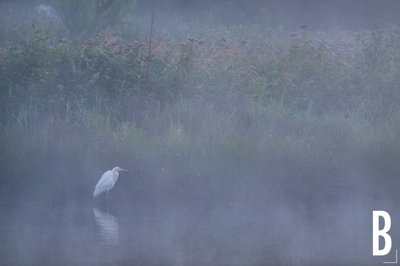 Een Grote zilvereiger rustend in een plas in natuurgebied De Luysen op een mistige ochtend bij zonsopkomst.