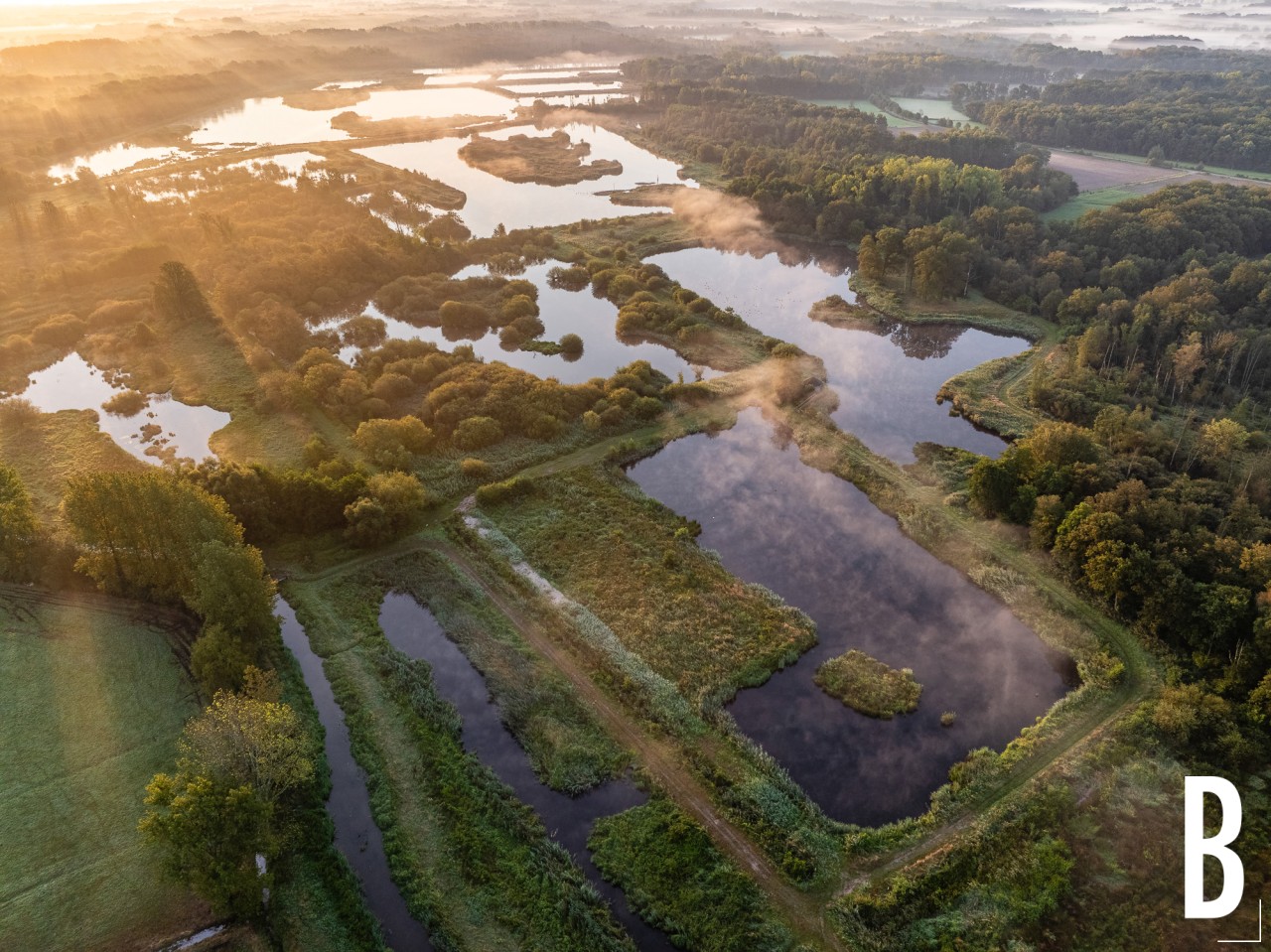 Natuurgebied De Luysen met haar talrijke vijvers gezien vanuit de lucht op een mistige najaarsochtend.