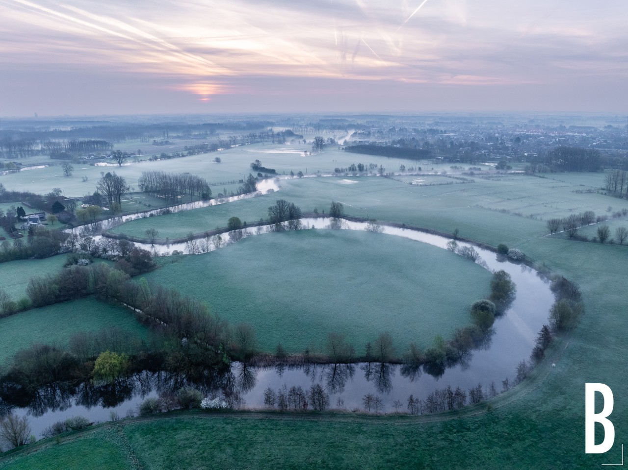 De Oude Leie, deel van Natuurpark Levende Leie, gezien vanuit de lucht op een mistige ochtend in de vroege lente.