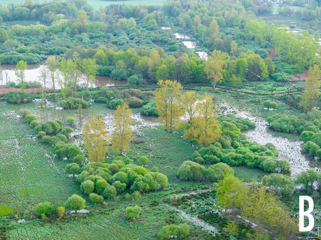 Moerasgebied de Demerbroeken gezien vanuit de lucht op op een mooie ochtend in het voorjaar. Het landschap kleurt prachtig door de variëteit aan frisgroene lentekleuren.