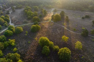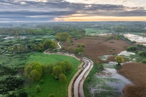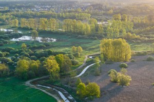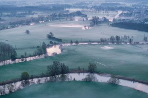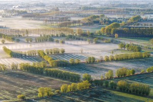 Moerasgebied de Demerbroeken gezien vanuit de lucht op op een mooie ochtend in het voorjaar. Het landschap kleurt prachtig door de variëteit aan frisgroene lentekleuren.
