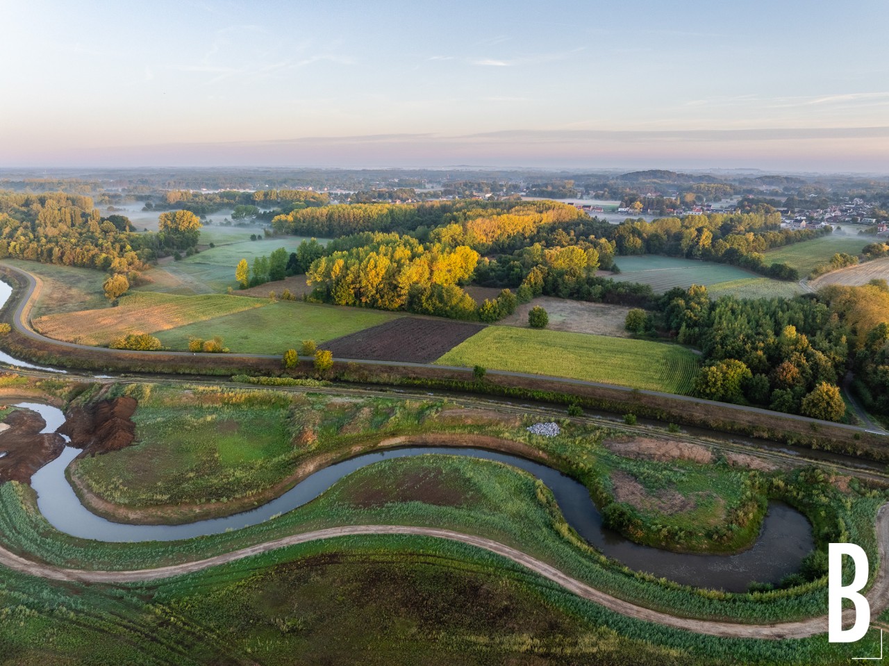 Bovenaanzicht van de bomen en velden in de nevel van de Demervallei.
