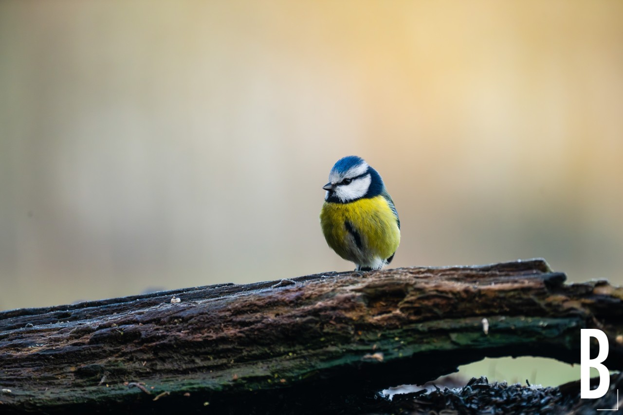 Een pimpelmees (Cyanistes caeruleus) op zoek naar eten tussen de takken.