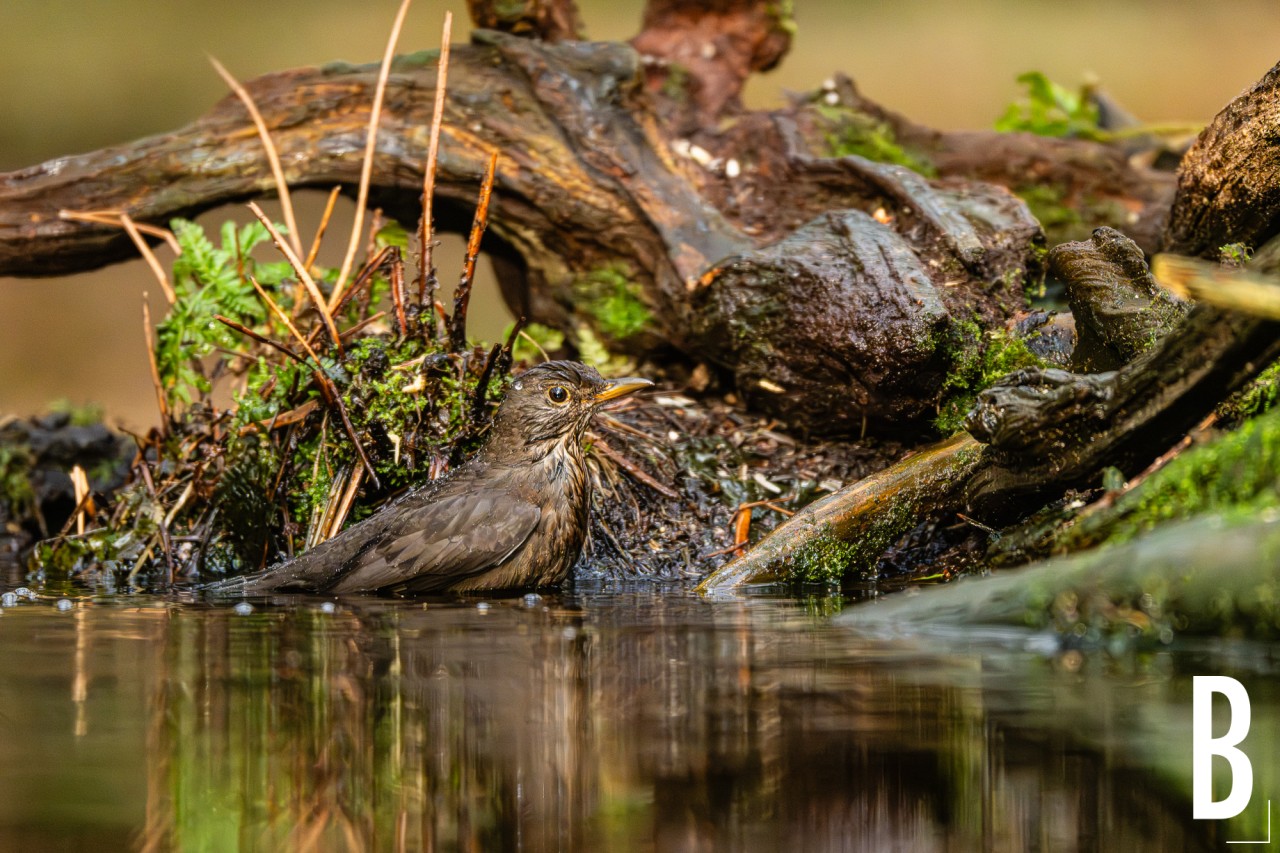 Een vrouwtje merel (Turdus merula) neemt een bad in de vijver bij de schuilhut.