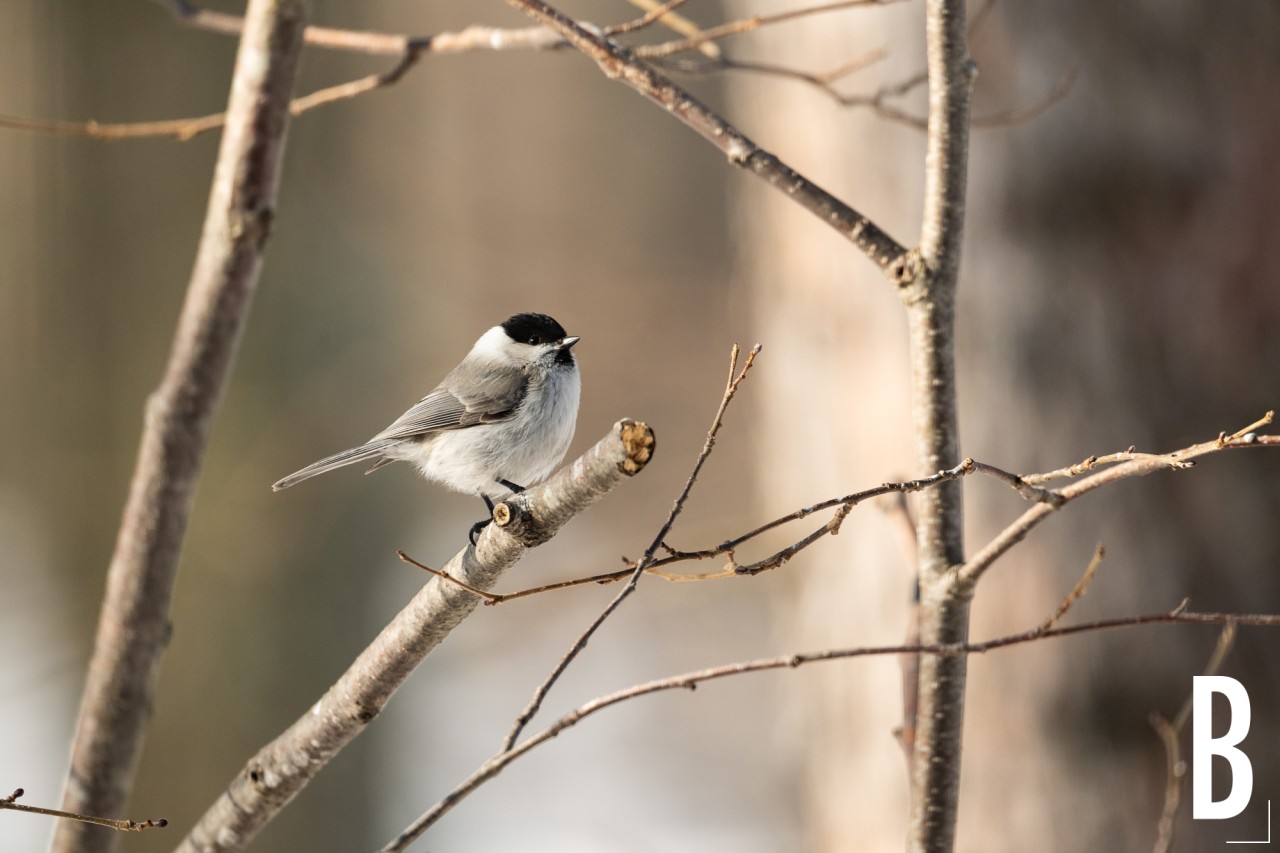 Detailopname van een matkop (Poecile montanus) in de winter van Japan.