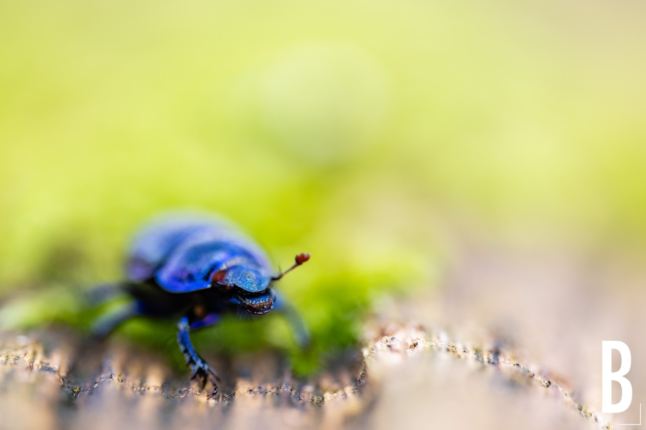 Een mestkever (Geotrupes stercorarius) op de bosbodem van het Raspaillebos in Geraardsbergen.