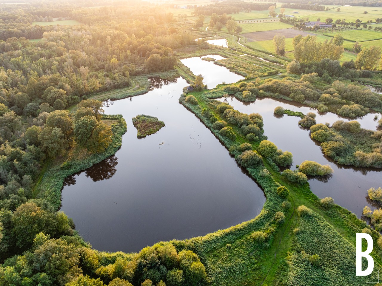 Natuurgebied De Luysen met haar talrijke vijvers gezien vanuit de lucht op een mooie avond in de late zomer.