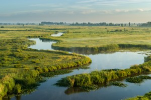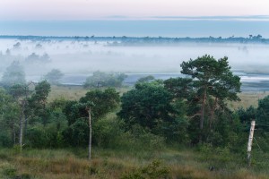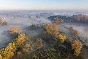 De natte Demerbroeken op een mistige zomerochtend gezien vanuit de lucht.