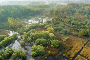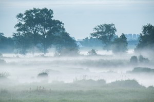 De natte Demerbroeken op een mistige zomerochtend gezien vanuit de lucht.