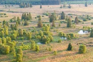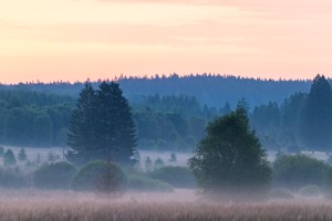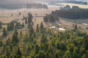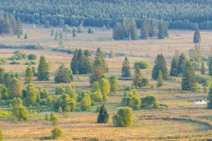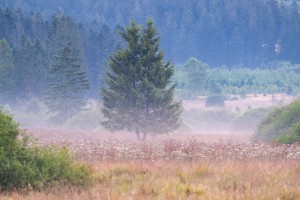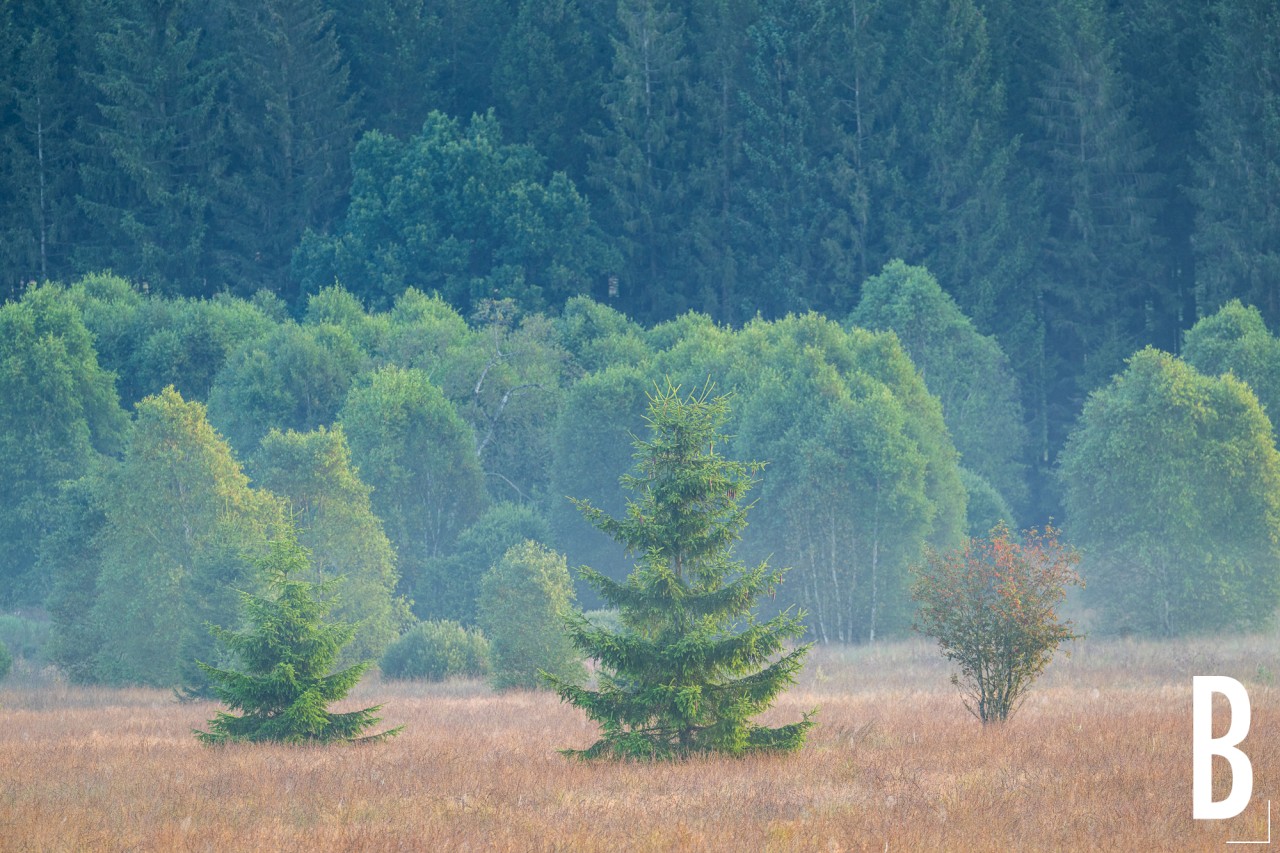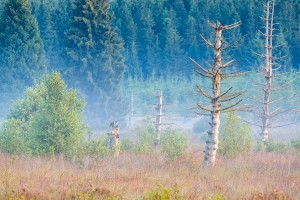 Nevel hangt boven het veengebied van Fagnes de la Petite Roer op een. mooie zomerochtend. Het gebied bestata uit een afwisseling van sparren, struiken en dode bomen.