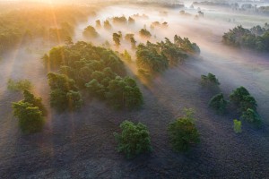 Natuurgebied de Kruibeekse polder met grachten, vijvers en dode bomen op een mistige voorjaarsochtend gezien vanuit de lucht.