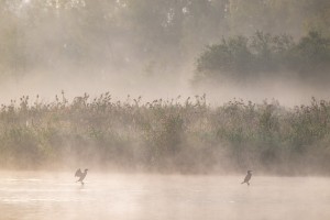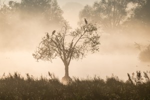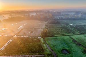 Laagjeslandschappen in het Mechels broek gezien vanuit de lucht op een mistige najaarsochtend.