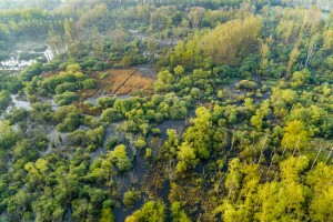 De kerk van Lombardsijde steekt boven de mist uit met de schorren en slikken van de IJzermonding in Nieuwpoort op de voorgrond.