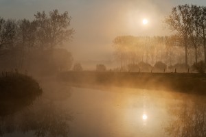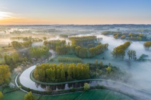 Taalgrensoverschrijdend natuurgebied de Rietbeemd gezien vanuit de lucht op een mistige ochtend in het vroege voorjaar.