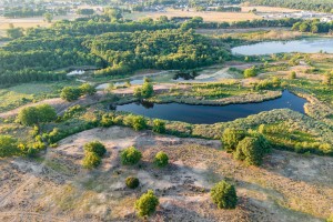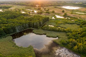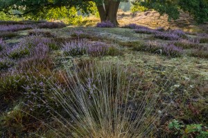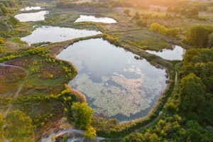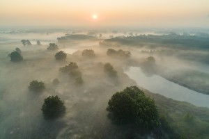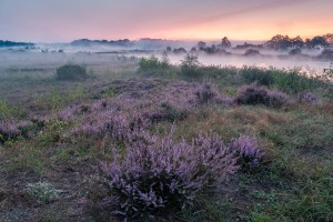 De opkomende zon zorgt voor een prachtig lichtspel en bonte kleuren aan de oevers van een ven vol met riet in natuurreservaat de Maten.