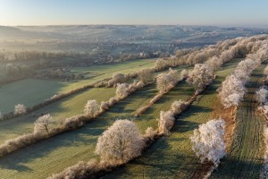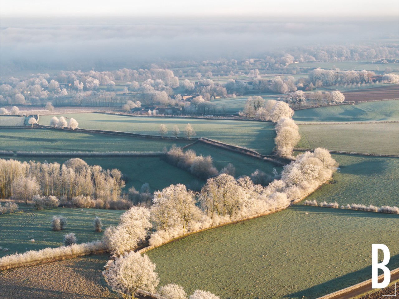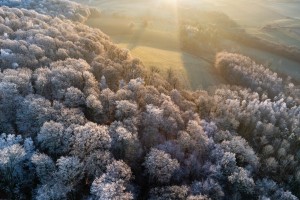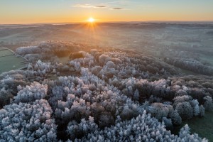 De heuvels en valleien van de Voerstreek gehuld in een winters kleedje gezien vanuit de lucht.