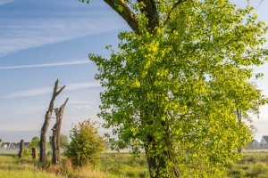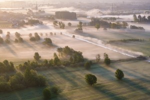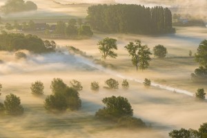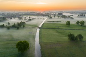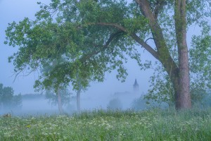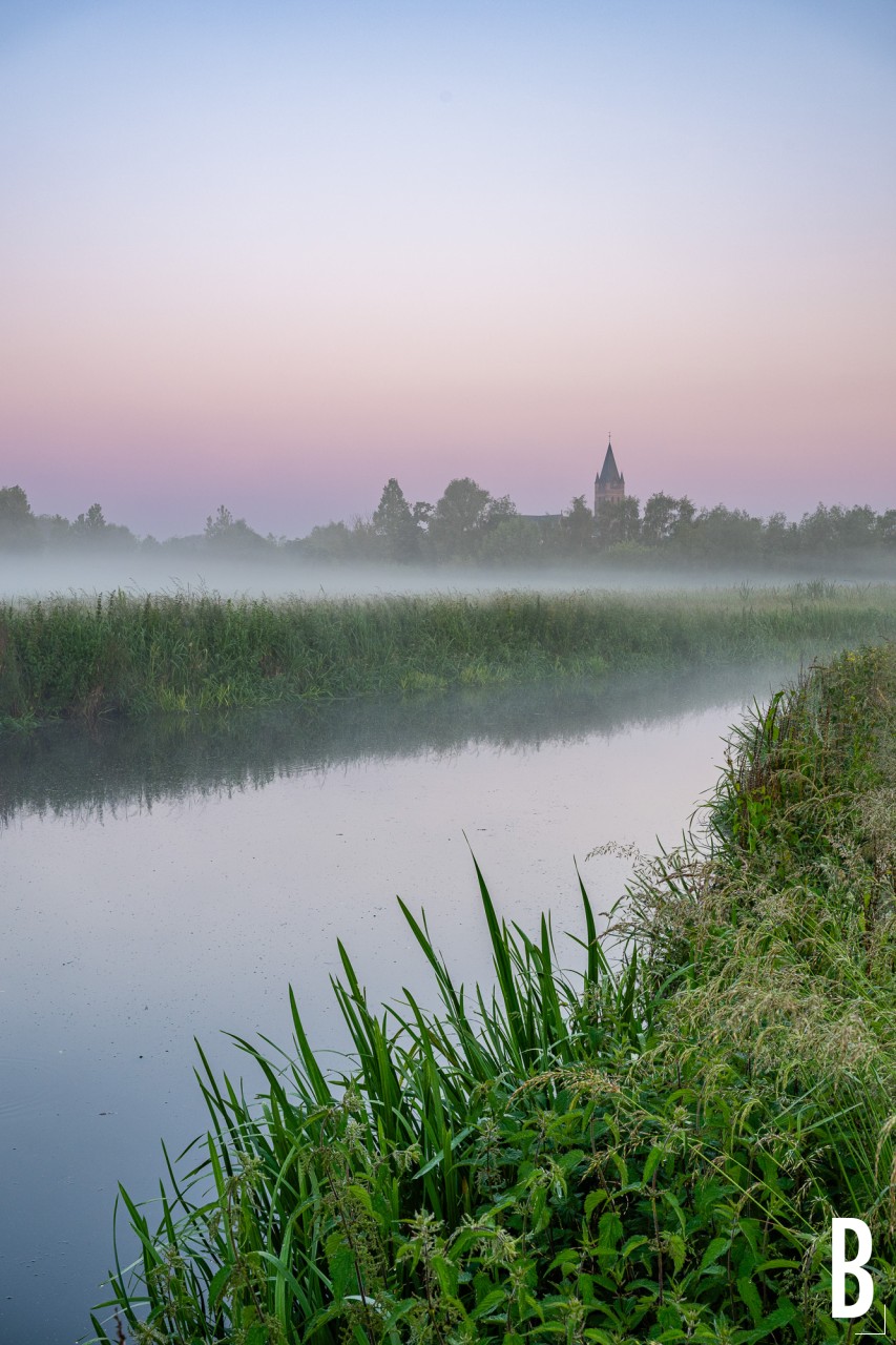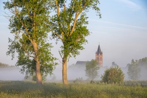 Een mistige ochtend langs één van de grachten in de Avelgemse Scheldemeersen. De kerk van Avelgem steekt boven de horizon uit.