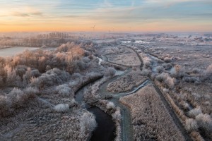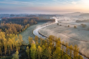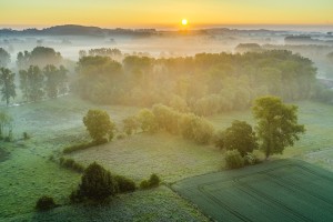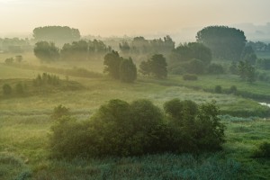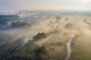 De Avelgemse Scheldemeersen met de kerk van Avelgem die boven het landschap uitsteekt op een mistige voorjaarsochtend.