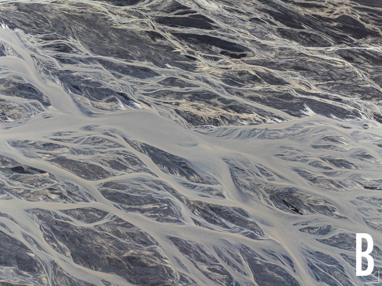 Een abstracte luchtfoto van een meanderende rivier in de spoelzandvlakten rondom Maelifell.