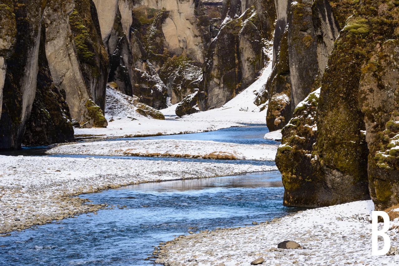 Fjaðrárgljúfurkloof met een meanderende rivier tussen de wanden met sneeuw