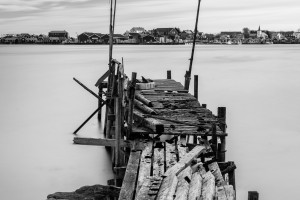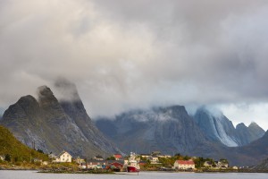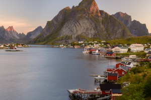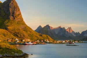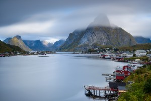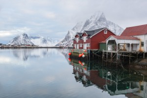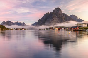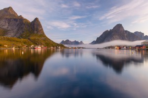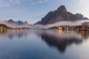 Nikon digitale camera fotografeert reflecties van de bergen in een windstille fjord nabij het bekende vissersdorp van Reine.