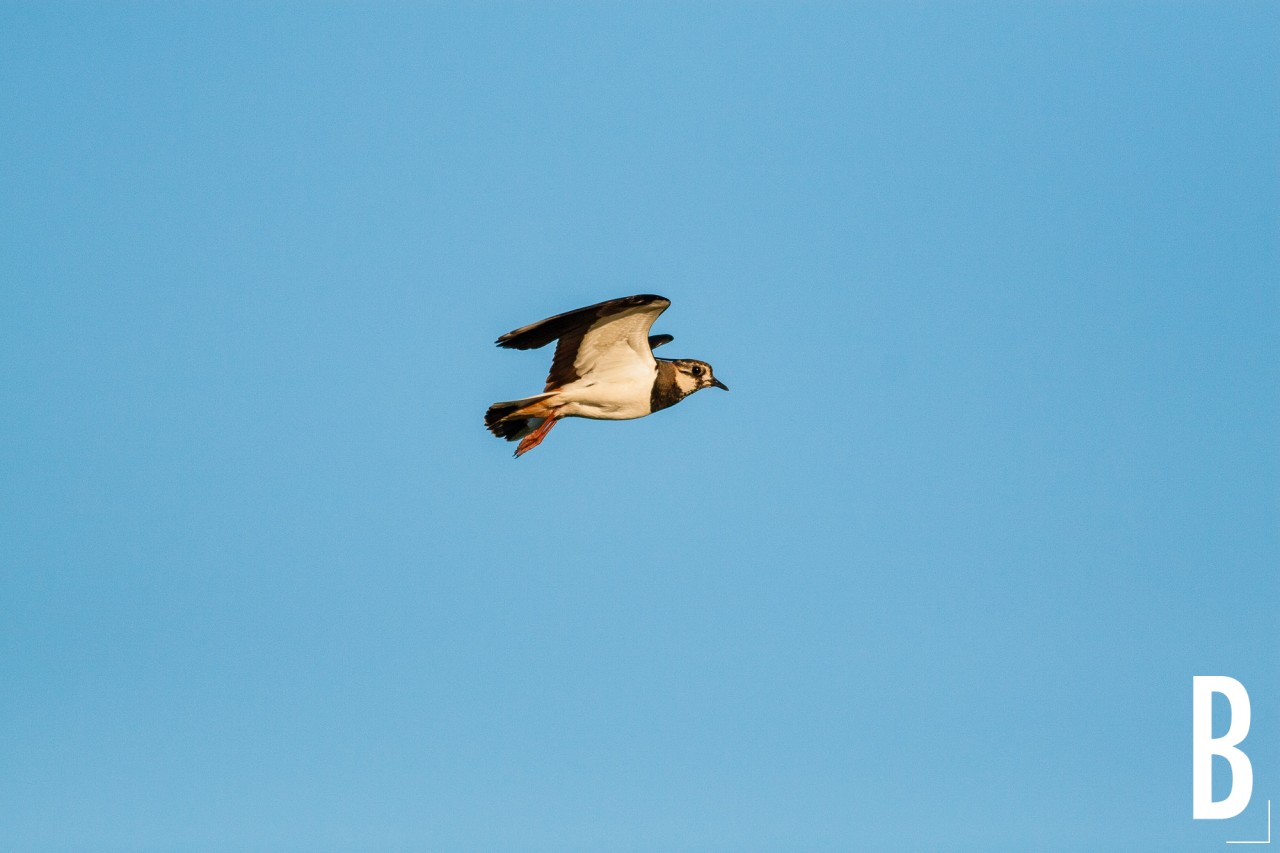 Een kievit (Vanellus vanellus) die zijn territorium verdedigt boven de velden van de Scheldevallei.