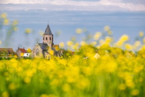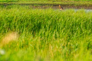 Kleine zilverreiger fourageert in een nat weiland in de Uitkerkse polder vol met witte bloemen van waterranonkel.