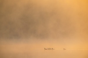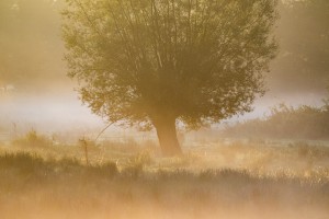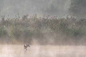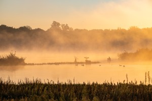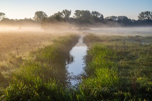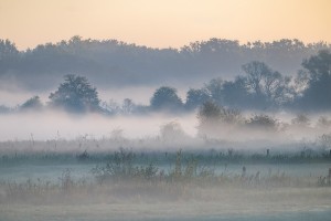 Natuurreservaat het Mechels Broek aan de oevers van de Dijle op een mistige najaarsochtend gezien vanuit de lucht.