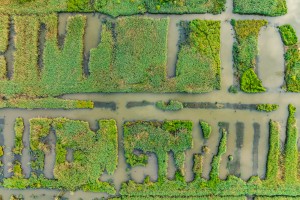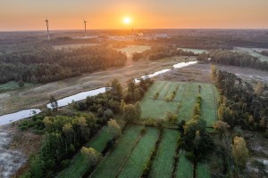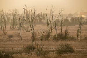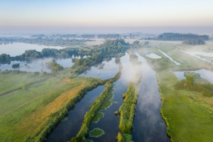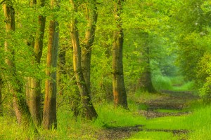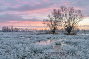 Zonnestralen priemen door het gebladerte van een boom in de Demerbroeken. De grassen in de voorgrond lichten prachtig op in het ochtendlicht.