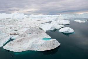 Gigantische ijsbergen drijven rond en reflecteren in het water rondom Rode O.