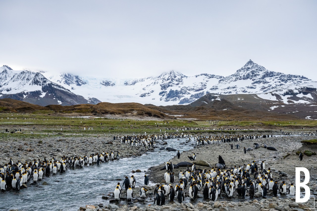 Groepjes ruiende Koningspinguins langs een riviertje op St. Andrew's Bay.