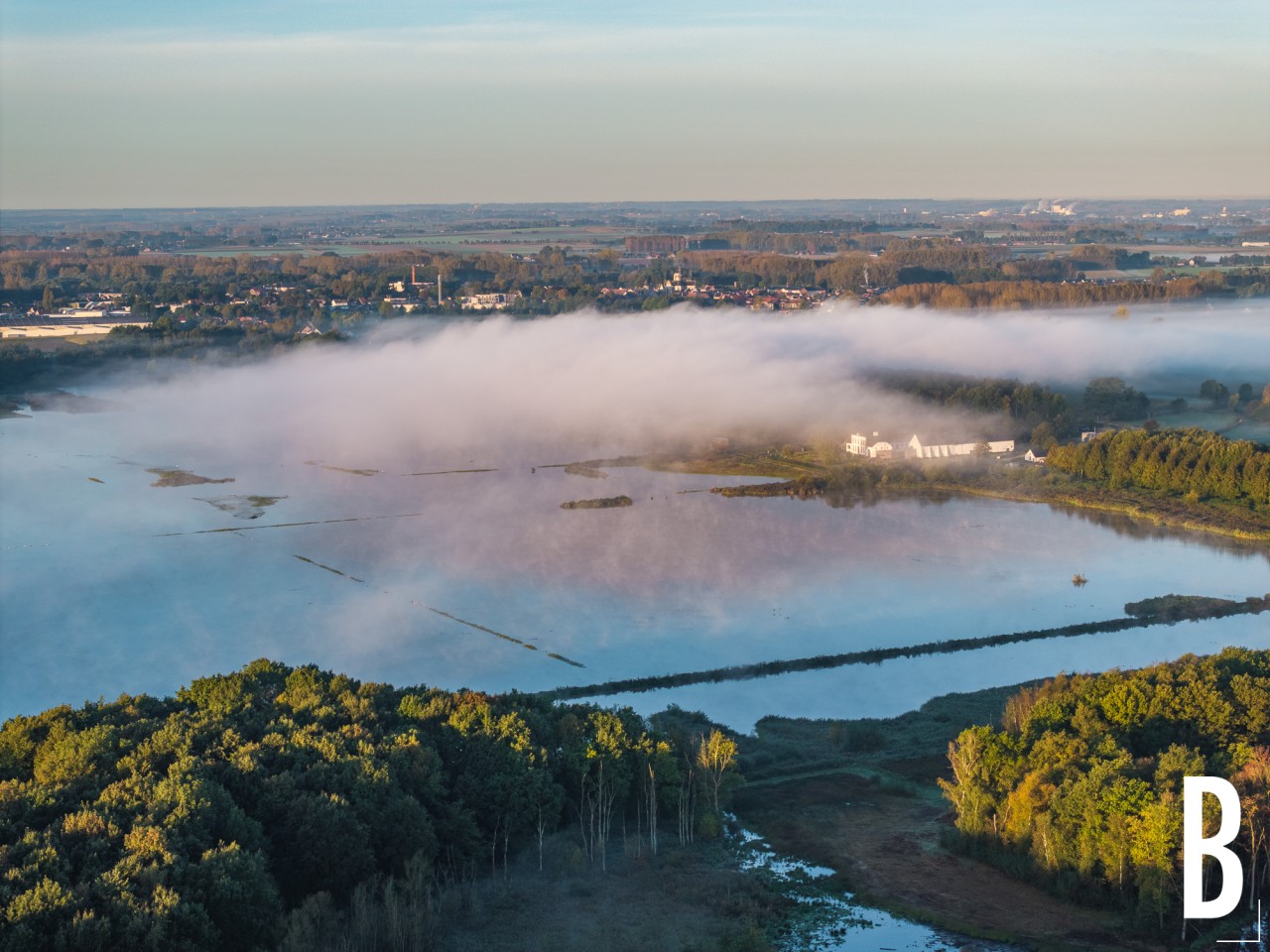 Provinciedomein Het Vinne gezien vanuit de lucht op ene mistige najaarsochtend.