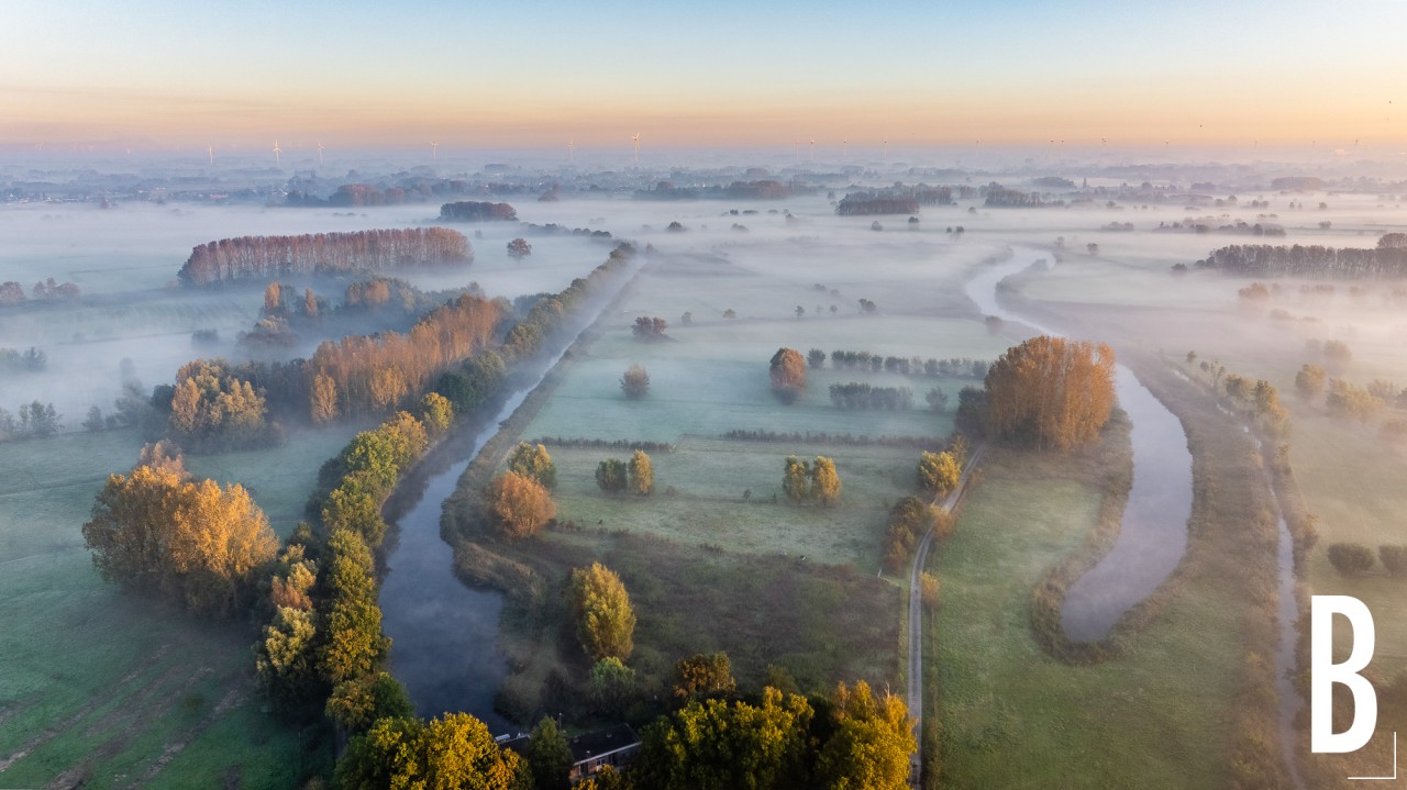 Natuurgebied de Kalkense meersen op een mistige najaarsochtend gezien vanuit de lucht.