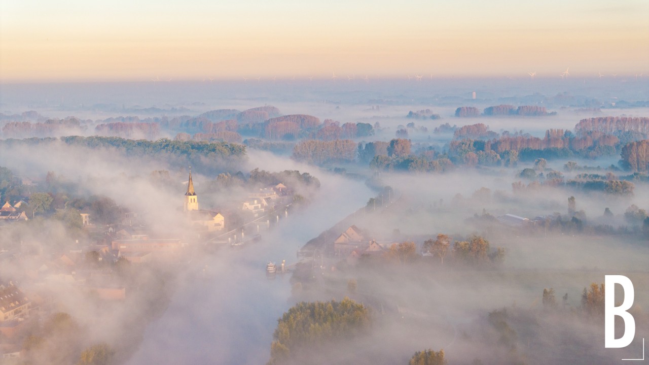 De kerk van Schellebelle aan de oevers van de Schelde steekt boven de wolken uit op een mistige najaarsochtend.