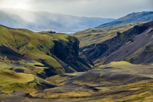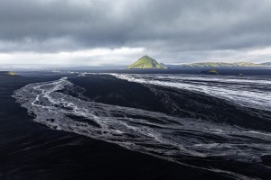 Luchtfoto van het vulkanische landschap in het binnenland van IJsland. De iconische Maelifell rijst op uit de uitgestrekte aswoestijn van Mælifellssandur, omringd door bergen, rotsen en dreigende wolken