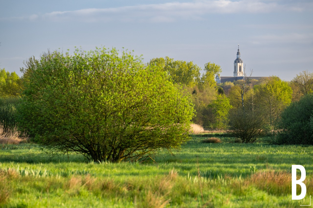 De Abdijkerk van Averbode steekt boven het moeraslandschap van de Demerboeken uit.