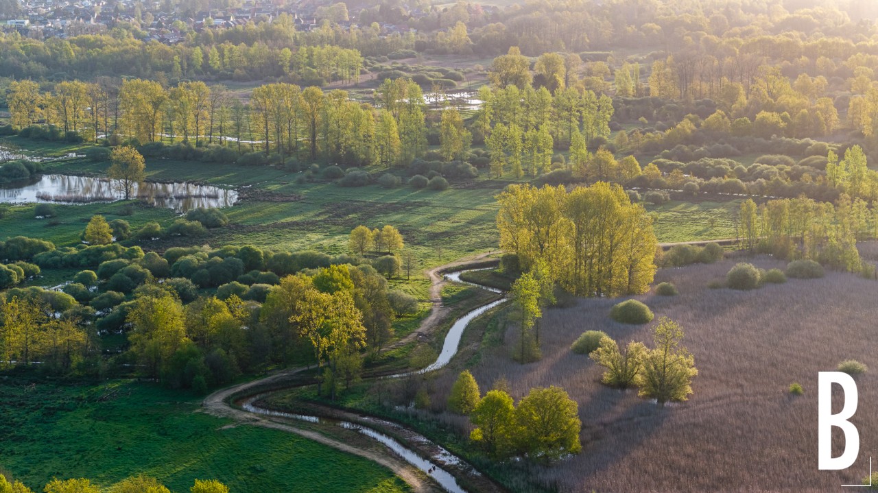 Moerasgebied de Demerbroeken gezien vanuit de lucht op op een mooie ochtend in het voorjaar. Het landschap kleurt prachtig door de variëteit aan frisgroene lentekleuren.