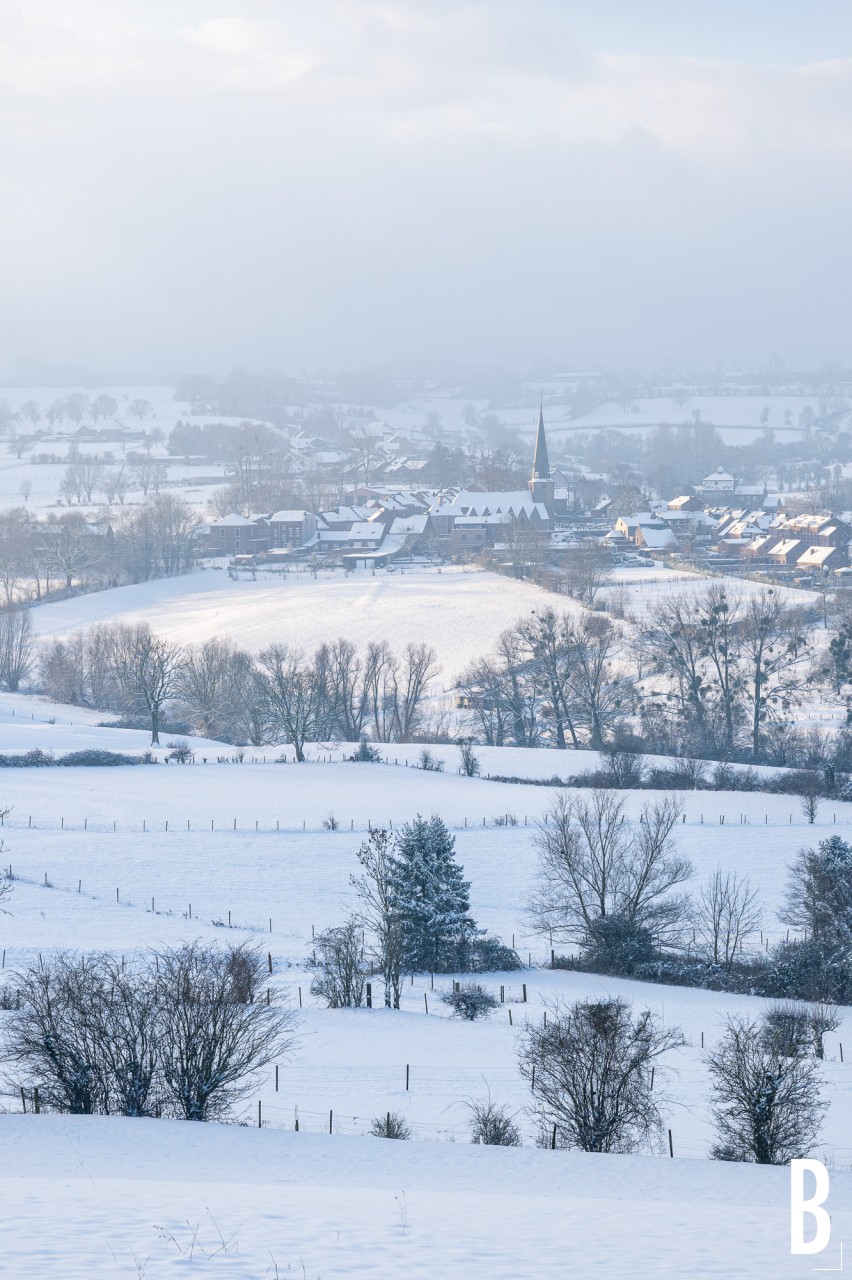 Zicht op het dorpje Charneux op een winterse ochtend in het land van Herve.