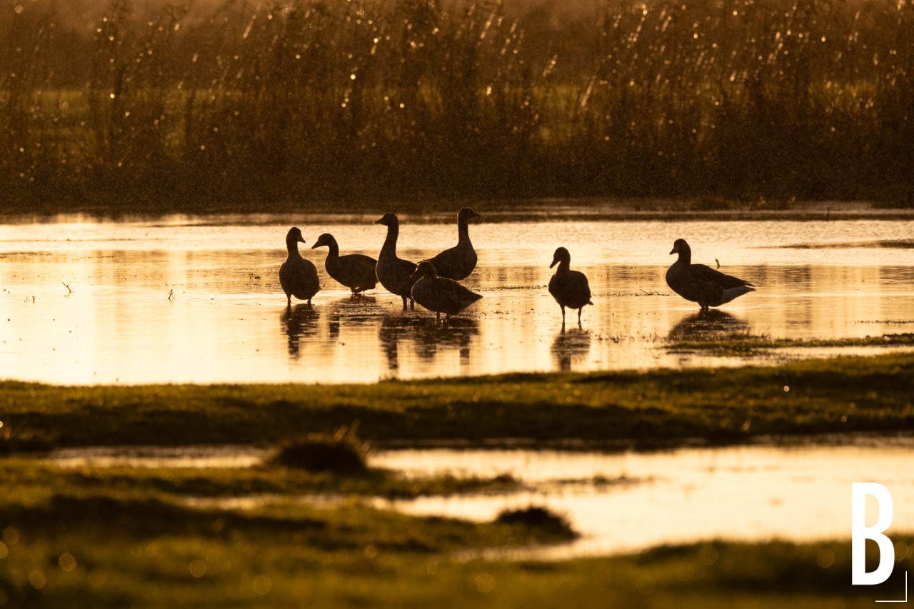 Een groep grauwe ganzen (Anser anser) in het moerasgebied van de Blankaart onder een laagstaande zon.