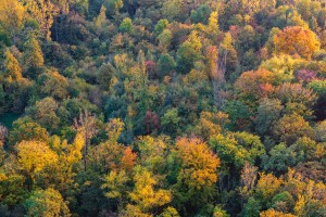 Luchtfoto van de verkleurende boomkruinen van Bos 't Ename bij zonsondergang.
