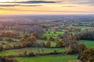 Luchtopname van de uitgestrekte nevels die over het landschap van de Vlaamse Ardennen hangen.