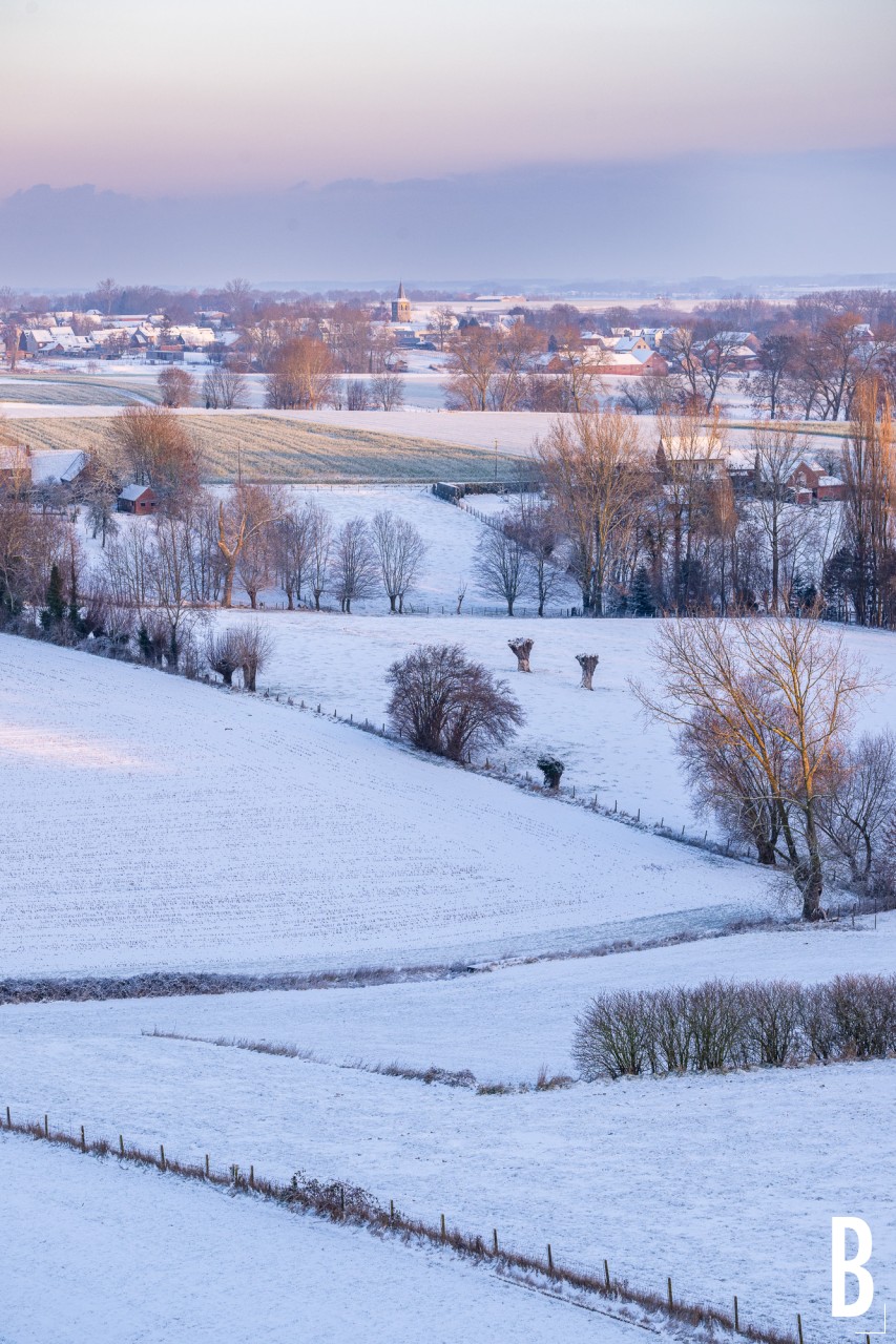 De dorpskerk van Elst te midden van de besneeuwde velden en hagen van de Vlaamse Ardennen.