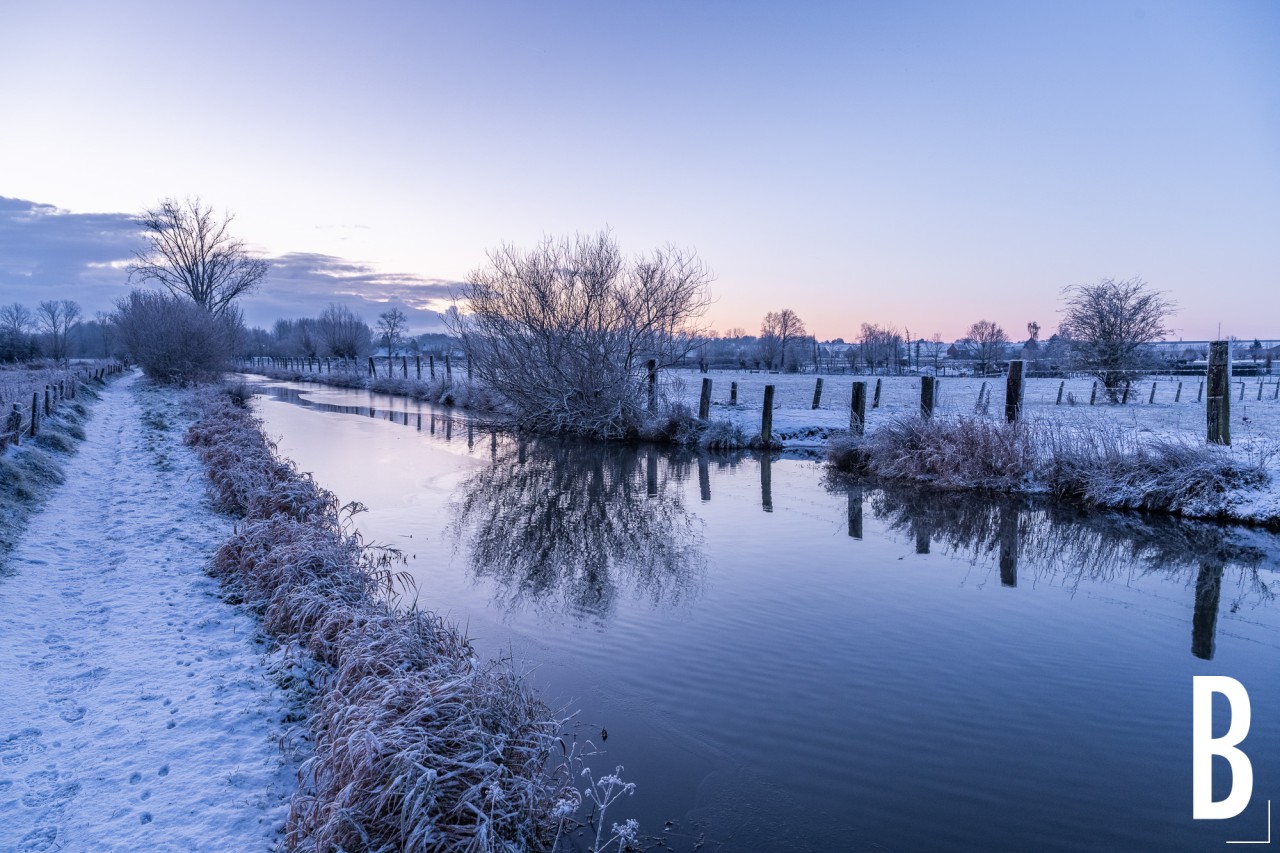 Verstild winterbeeld van knotwilgen langs de Zwalmbeek in Munkzwalm tijdens het ochtendgloren.