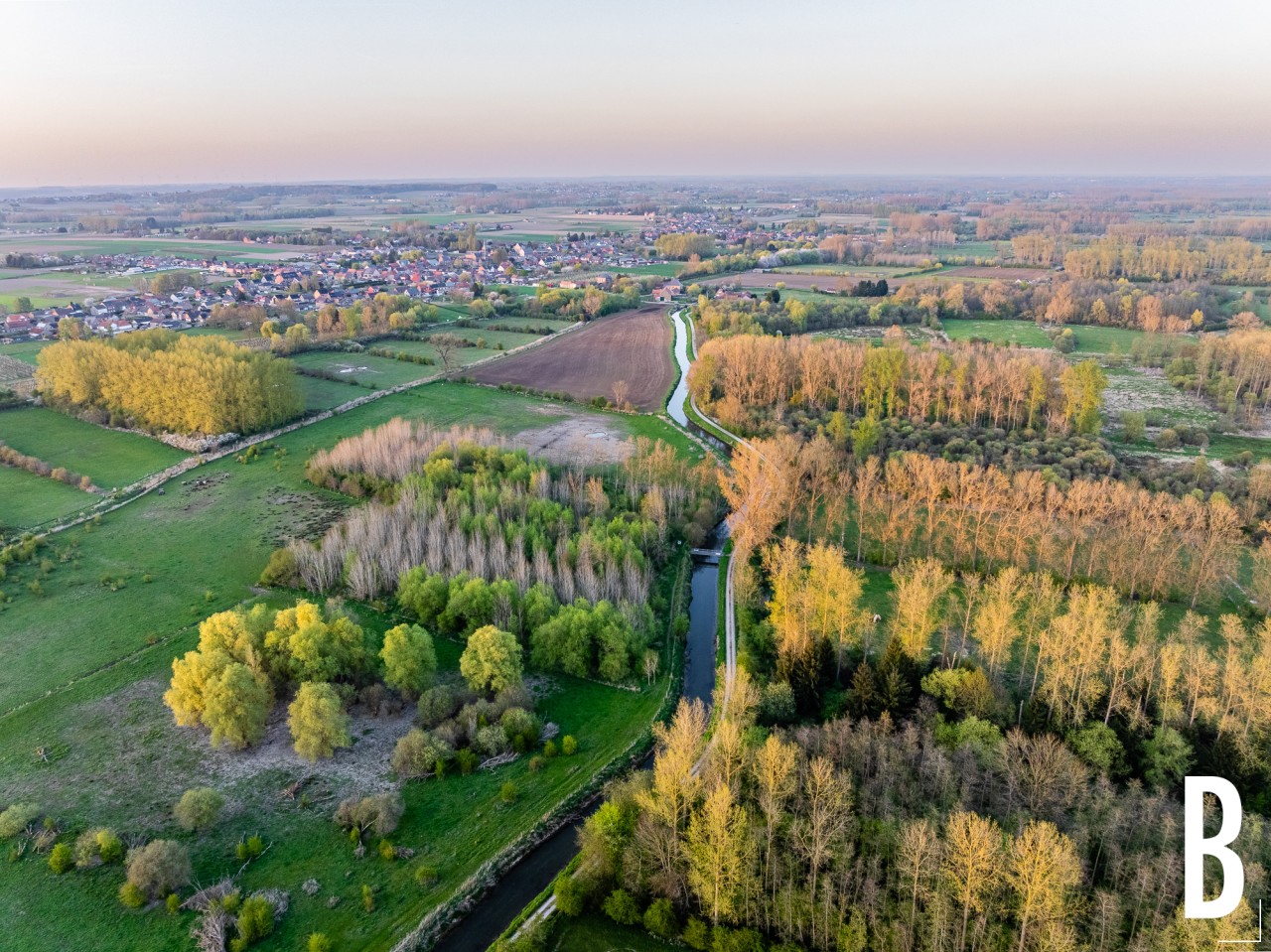 Luchtfoto van de Grote Gete die door de velden van Linter kronkelt.