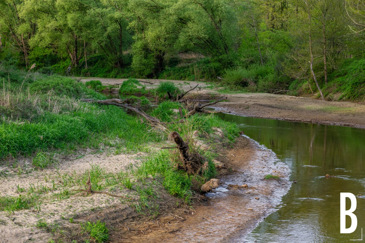 Zicht op de herstelde meanders van de Demer tijdens een lenteavond te Rotselaar.