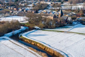 Sfeervolle luchtopname van de rivier de Demer onder een dik pak mist.